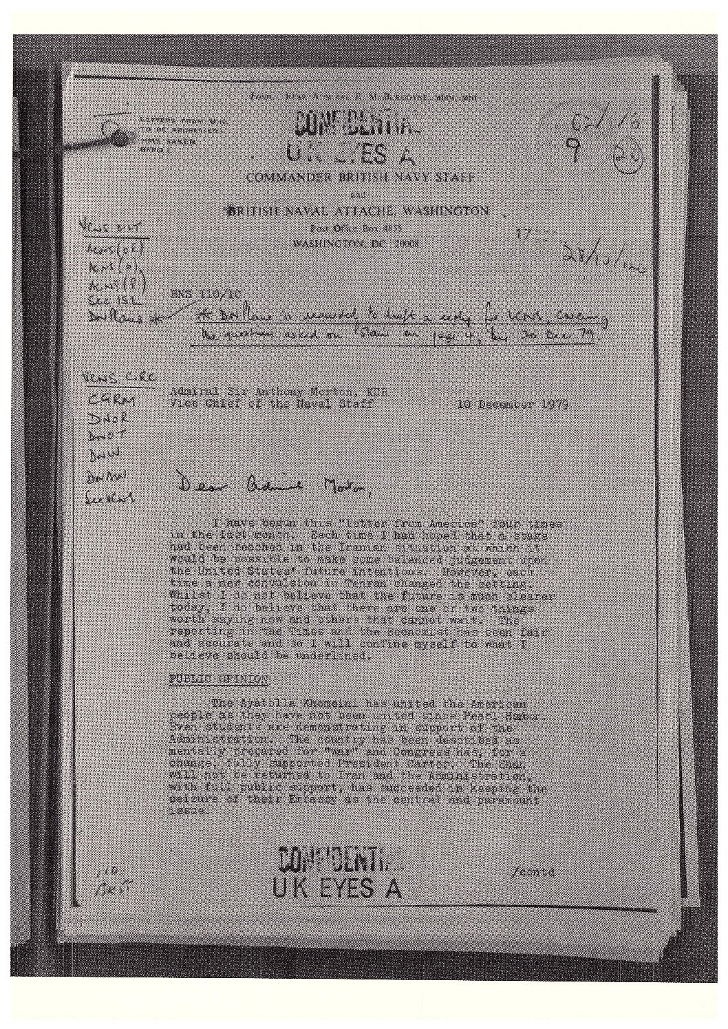 UK Government, Top Secret, ‘From British Naval Attache Washington’, Letter from America, Public Opinion / Diego Garcia / Defence Budget.