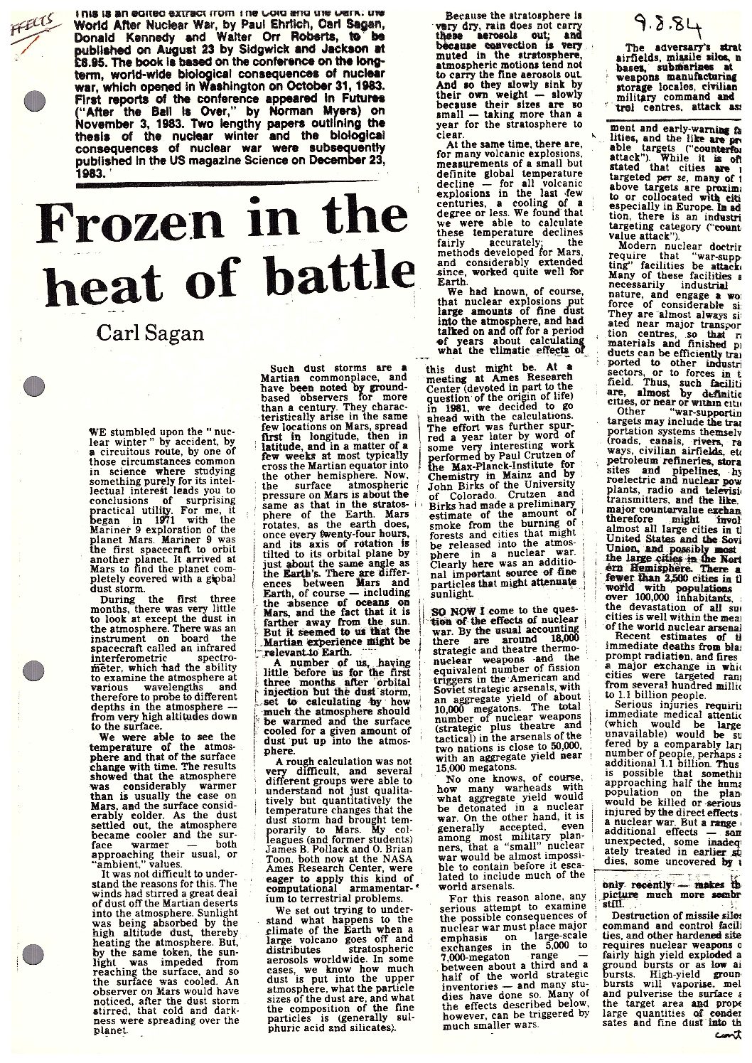 The Guardian, Carl Sagan, ‘Frozen in the heat of battle.’ Published: 14.07.2023 Tags: Ainslie Archive Box 8 Articles Cold War Nuclear Weapons Effects nuclear winter United Kingdom 09 August 1984. Attachments